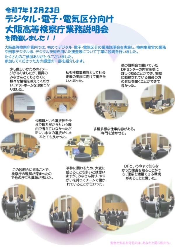 12月23日、大阪高等検察庁管内では、初めてデジタル・電子・電気区分の業務説明会を実施し、検察事務官の業務や刑事デジタル法、デジタル技術を用いた捜査等について丁寧に説明を行いました。