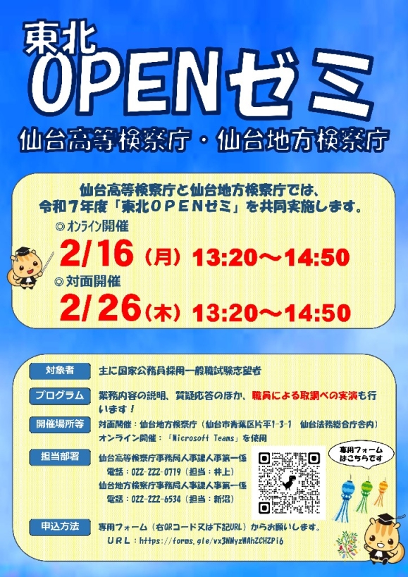 仙台高等検察庁・仙台地方検察庁では、「東北OPENゼミ」を以下の日程で共同開催します。