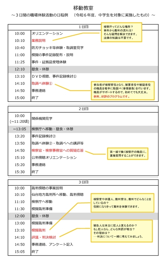 ・移動教室:皆さんに検察庁へ来ていただき、検察庁において業務説明等を実施。