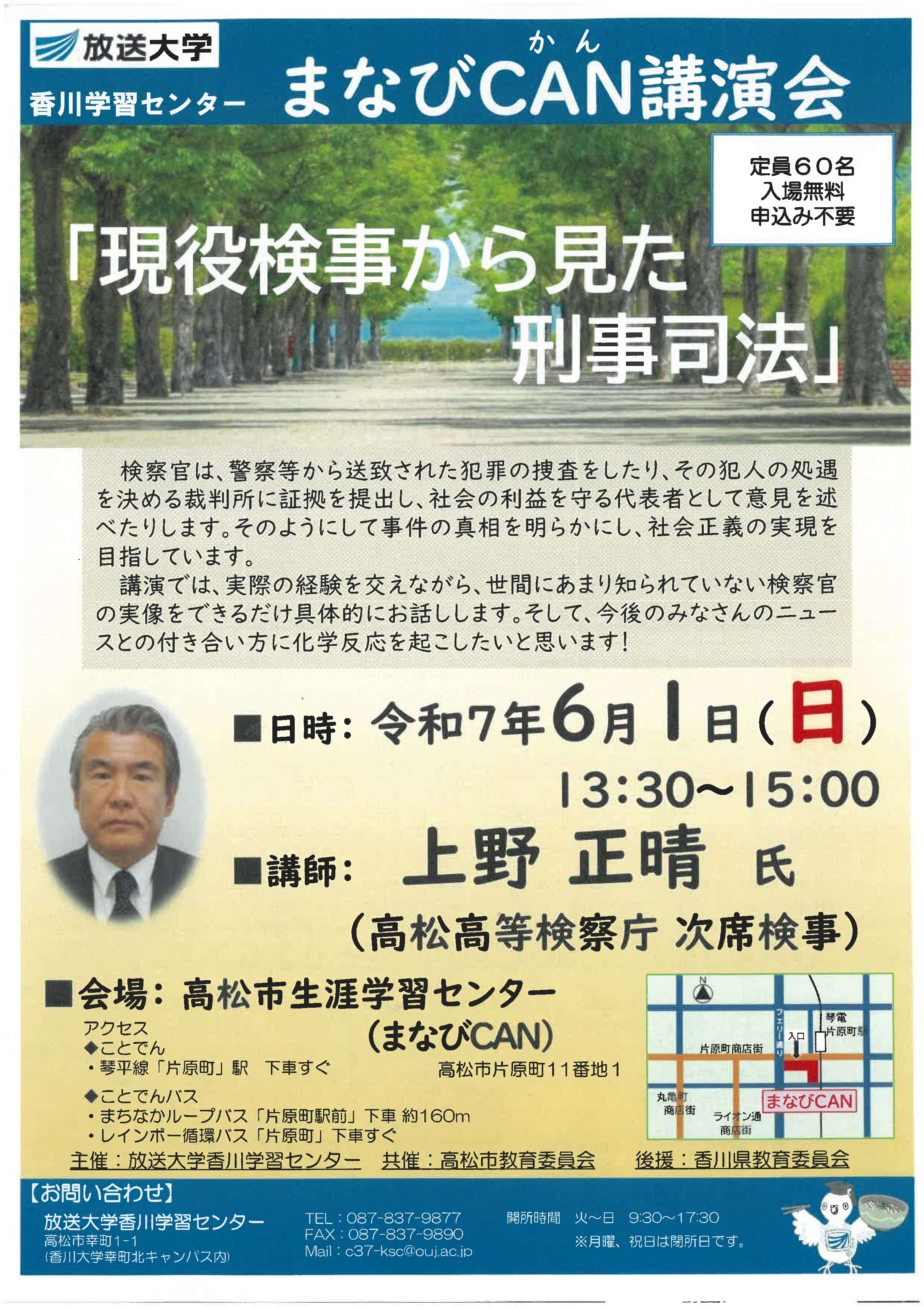 令和7年6月1日(日)、高松市生涯学習センターまなびCANで、当庁上野正晴次席検事による講演会が開催されました。 詳しくは、こちらをご覧ください。