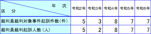 釧路地方検察庁が釧路地方裁判所に起訴した裁判員裁判対象事件の件数及び人員については次のとおりです。