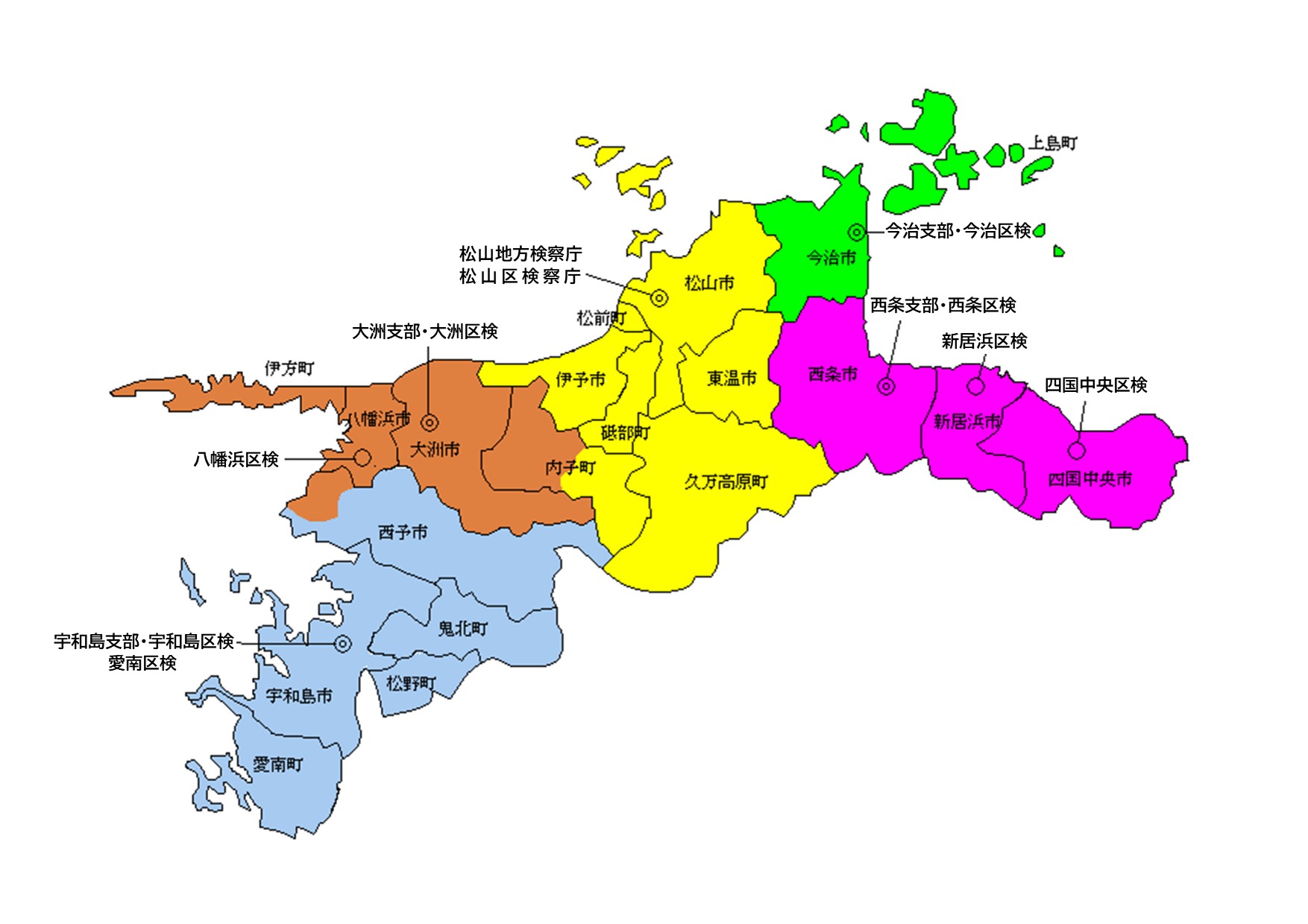 | 八幡浜 | 松山地方検察庁大洲支部内 | 八幡浜市 西予市の内、 三瓶総合支所の所管区域 西宇和郡 |