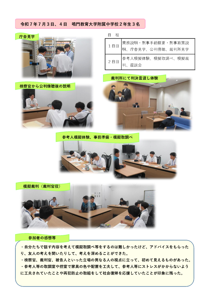また、御要望があれば、裁判所において法廷見学や刑事裁判を傍聴することも可能です(ただし、裁判所や公判の都合により実施できないこともありますので、あらかじめ御了承願います。)。